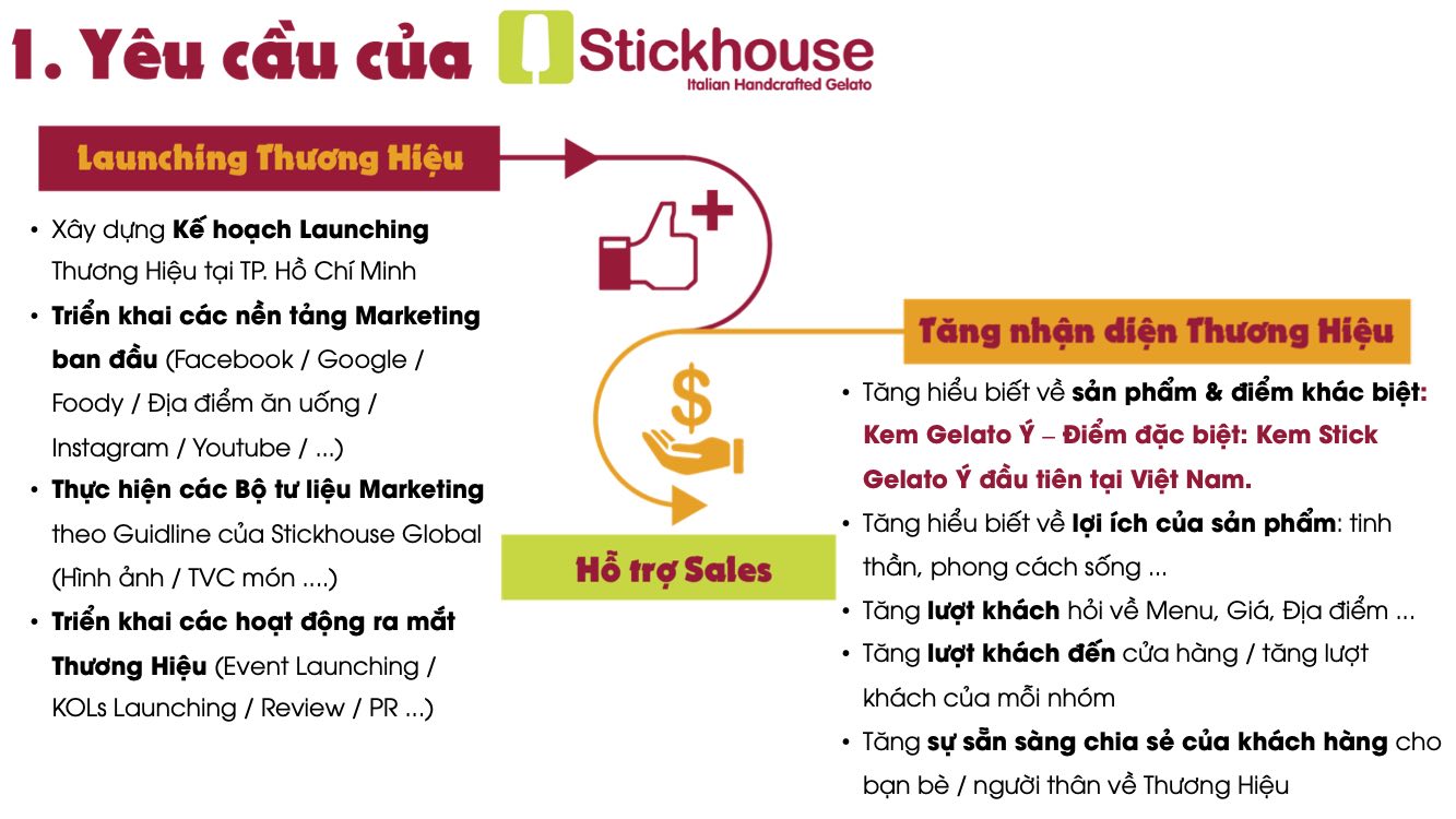 Khi Stickhouse đến Việt Nam, Họ có một nhu cầu mạnh mẽ để tăng nhận thức về thương hiệu cho người tiêu dùng Việt Nam rằng Stickhouse là một thương hiệu tráng miệng quốc tế của kem gelato Ý, cà phê và nước ép trái cây với các đặc tính: Gelato ngon tự nhiên / Nghệ nhân, nhưng rất sáng tạo / Thiết kế và sáng tạo 100% sản xuất tại Ý. Các thành phần và hương vị là 100% nguyên chất, không pha loãng hoặc nhân tạo hương vị