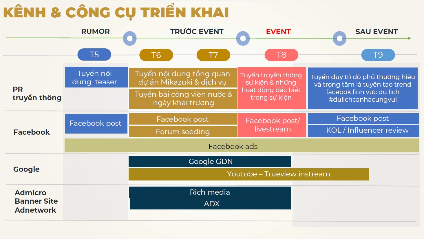 TMP có trách nhiệm tư vấn triển khai những hoạt động marketing xuyên suốt Tháng 5 – 9/2020. Tất cả kênh PR: Báo chí Việt Nam – Facebook - Google – Youtube – Các diễn đàn Du lịch. Mục tiêu đặt ra: