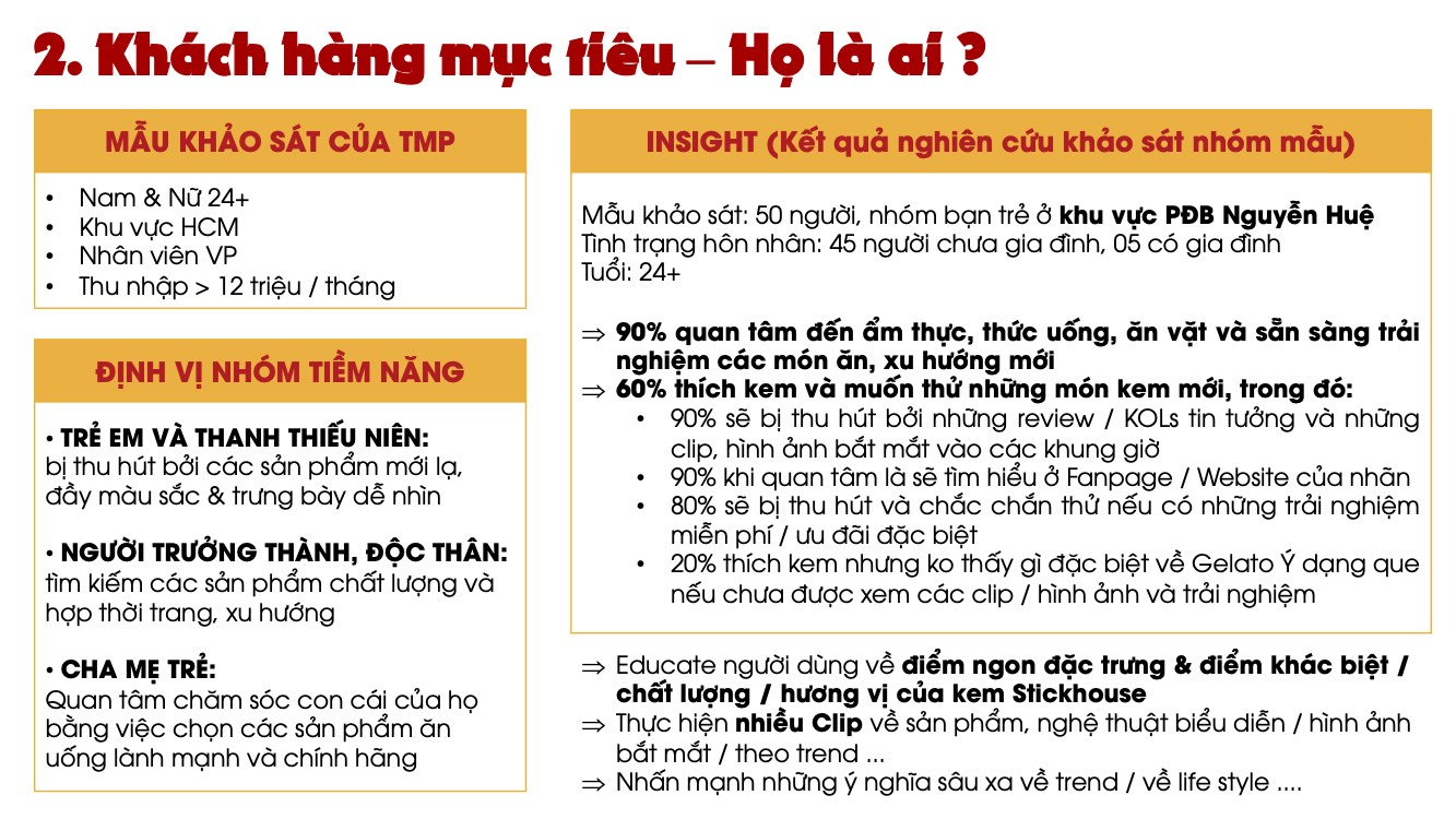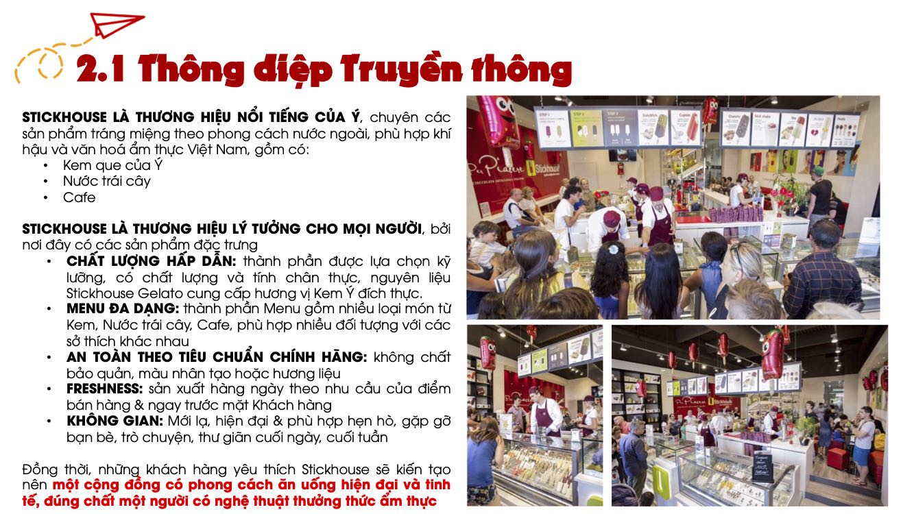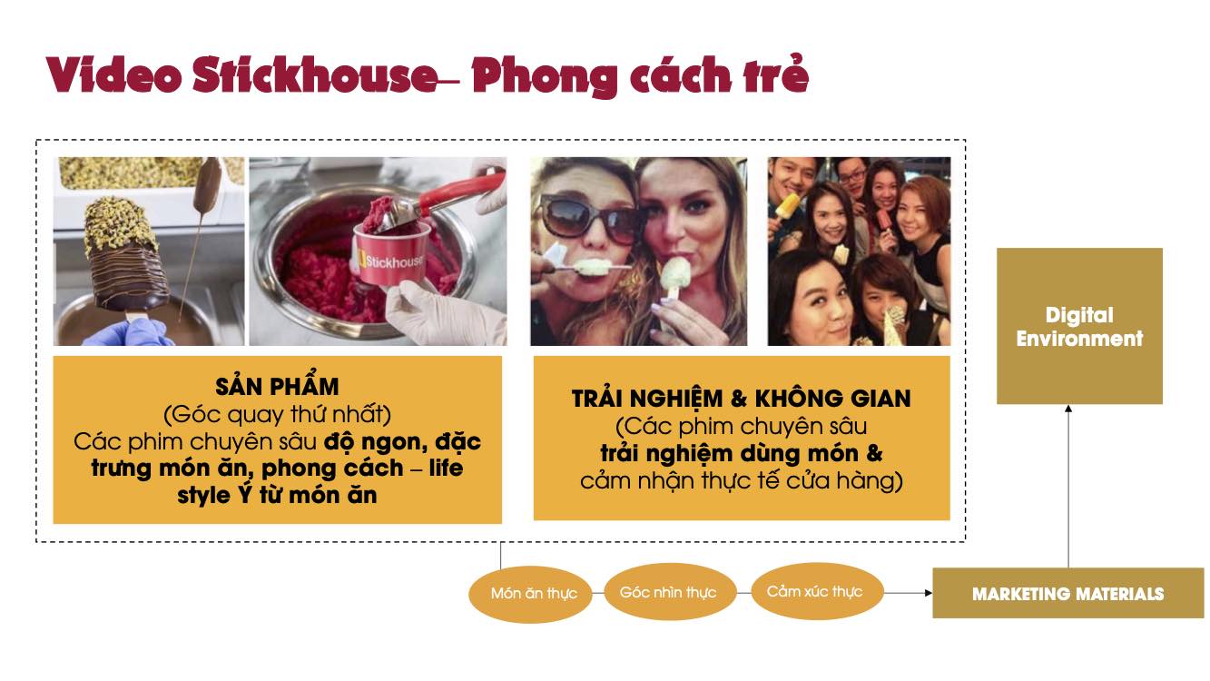 Khi Stickhouse đến Việt Nam, Họ có một nhu cầu mạnh mẽ để tăng nhận thức về thương hiệu cho người tiêu dùng Việt Nam rằng Stickhouse là một thương hiệu tráng miệng quốc tế của kem gelato Ý, cà phê và nước ép trái cây với các đặc tính: Gelato ngon tự nhiên / Nghệ nhân, nhưng rất sáng tạo / Thiết kế và sáng tạo 100% sản xuất tại Ý. Các thành phần và hương vị là 100% nguyên chất, không pha loãng hoặc nhân tạo hương vị
