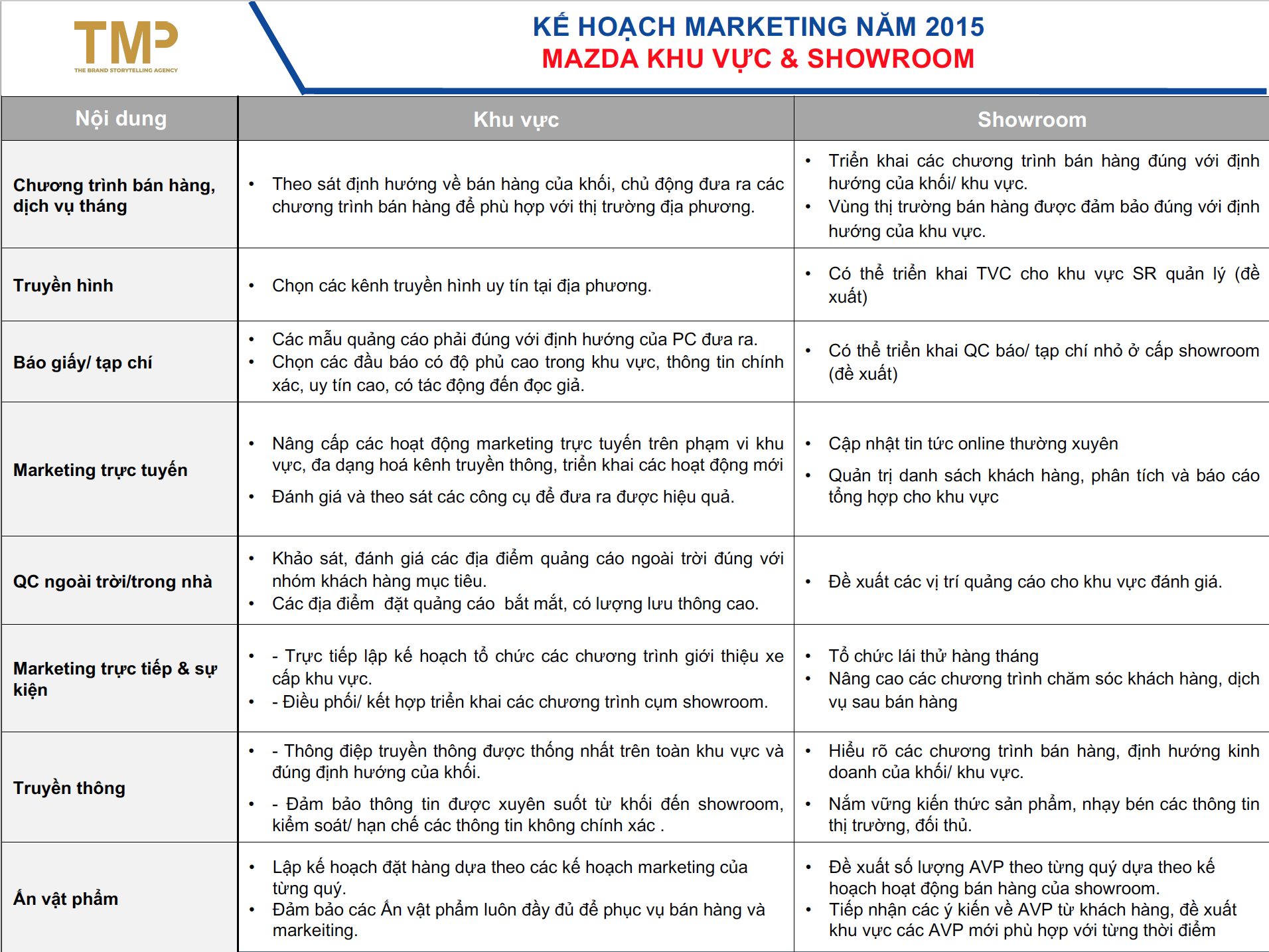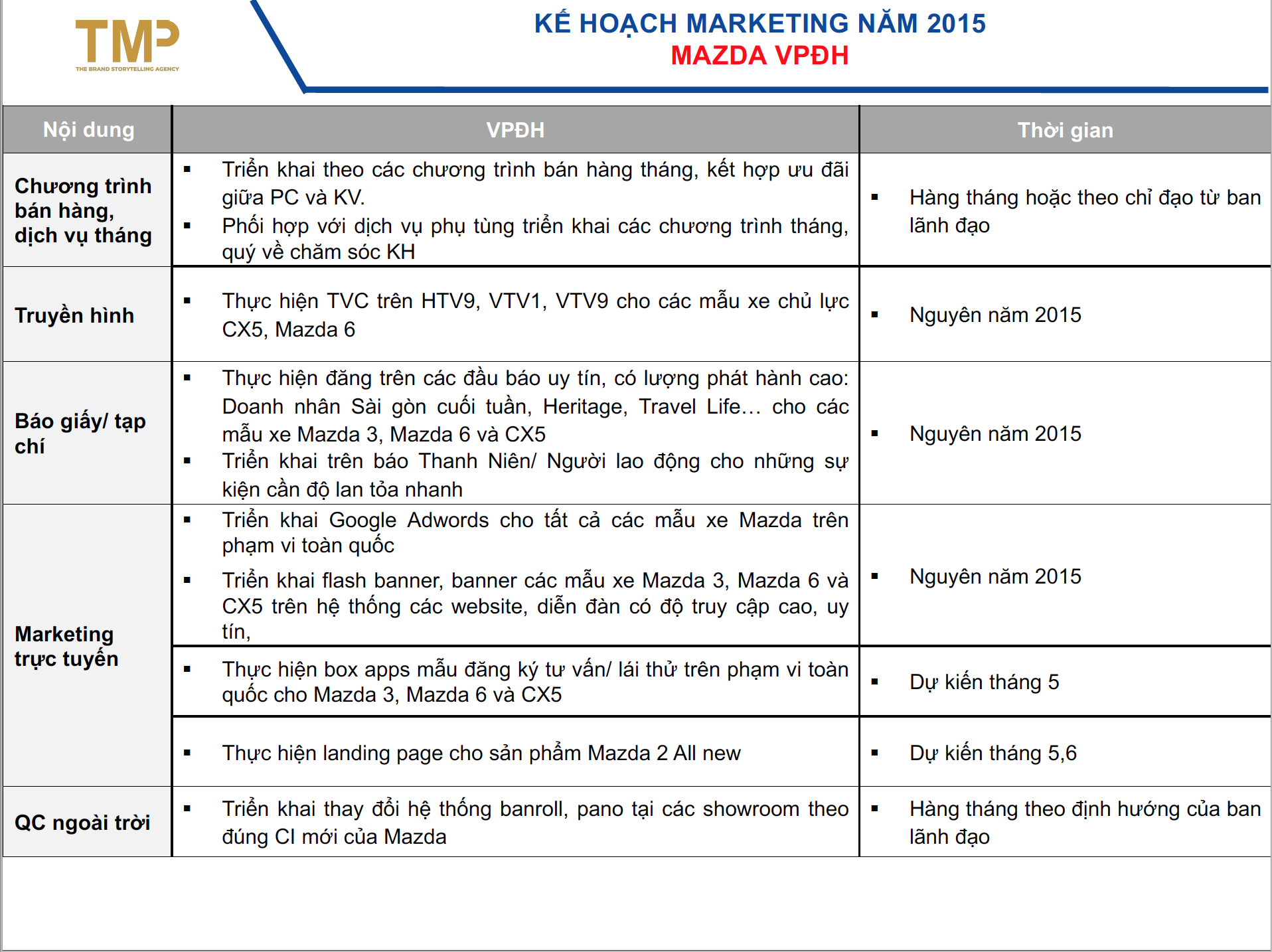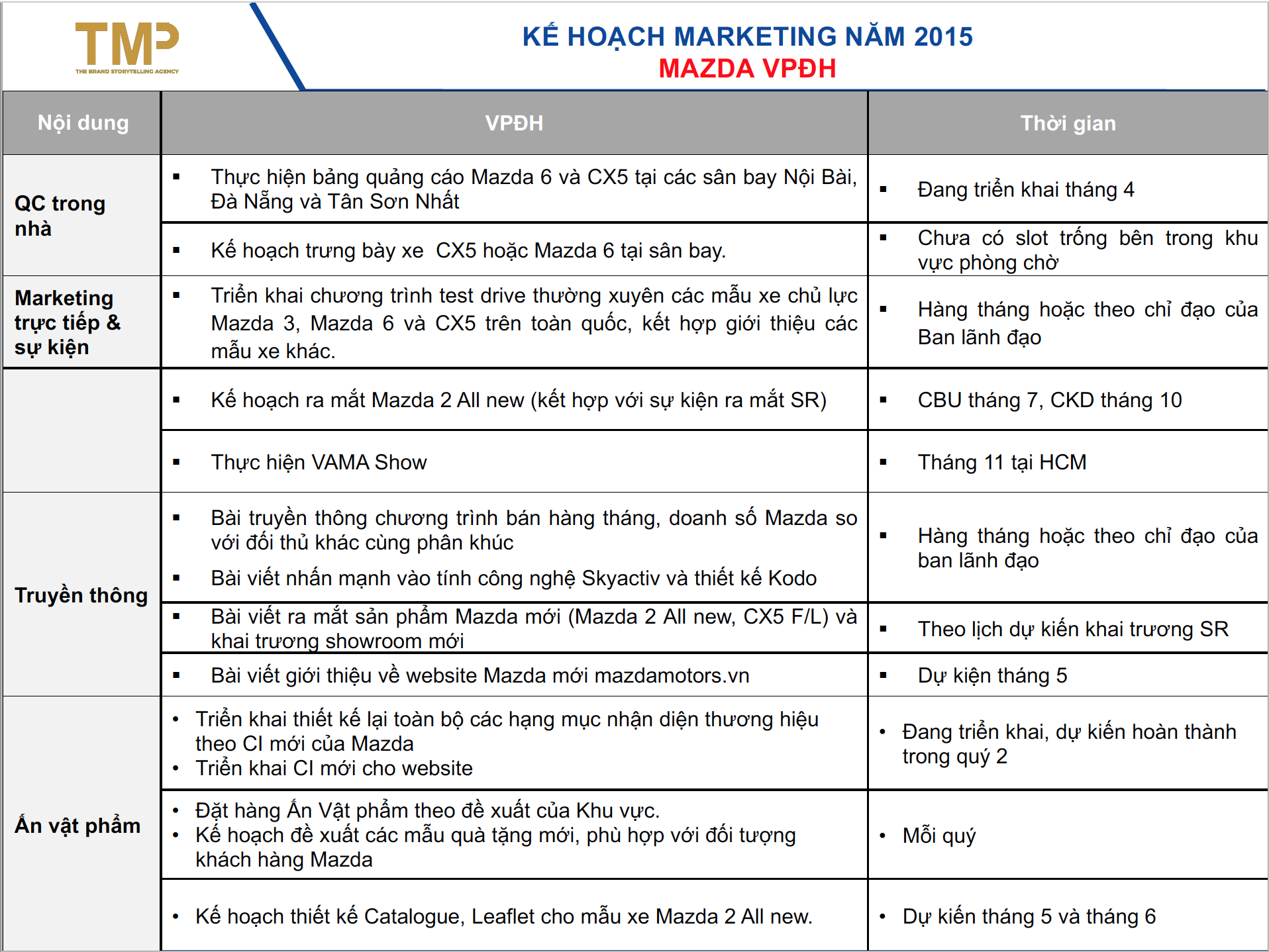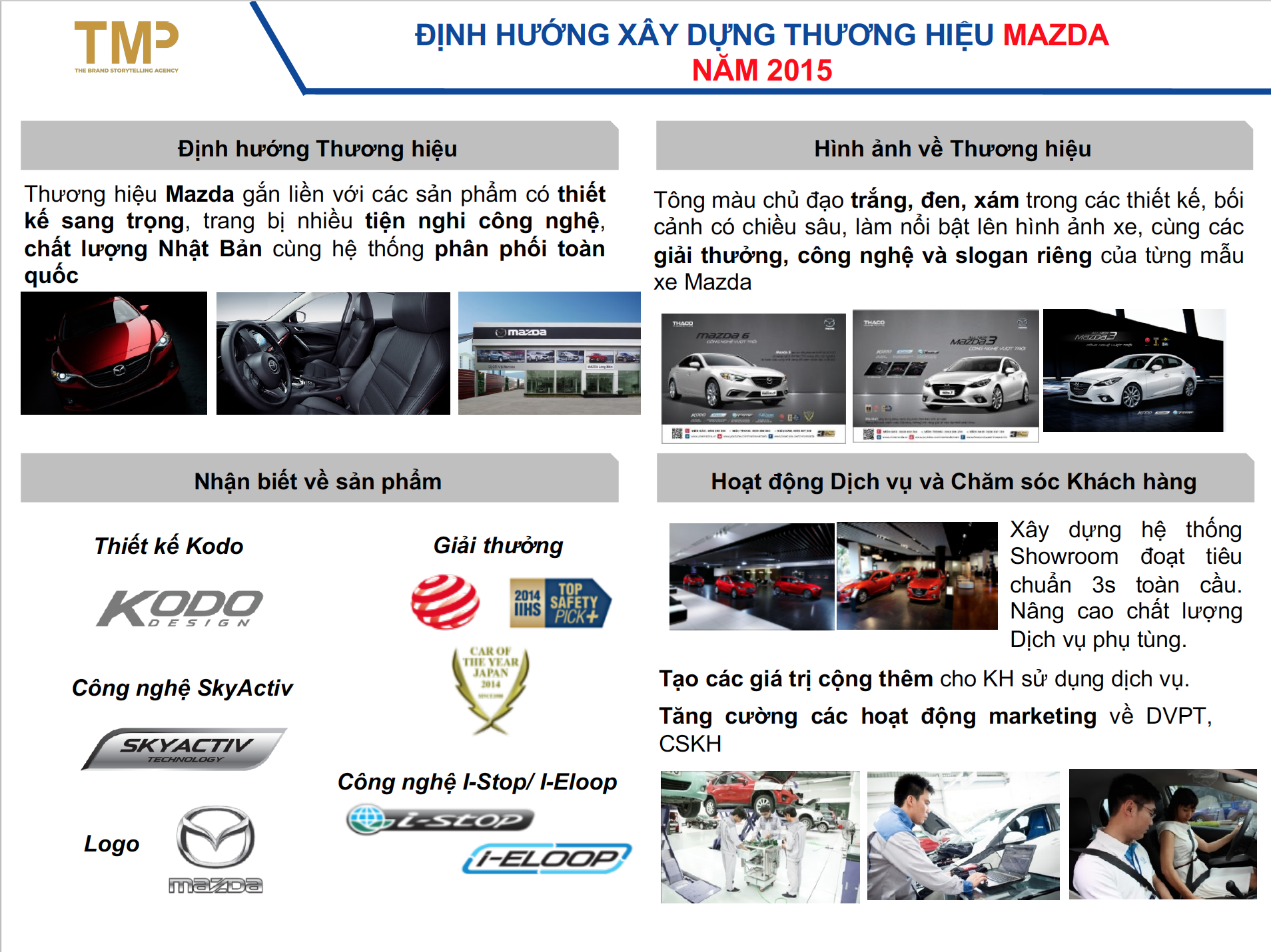 Với kinh nghiệm, sự nghiên cứu kĩ lưỡng về ngành cũng như thương hiệu ô tô lâu đời tại Nhật Bản, TMP vinh dự đuợc đồng hành cùng tập đoàn Trưòng Hải Auto phát triển kế hoạch marketing cho các dòng xe Mazda trong giai đoạn năm 2015-2016, góp phần khẳng định chất lượng cũng như sự uy tín của thương hiệu Mazda tại thị trường Vietnam.
