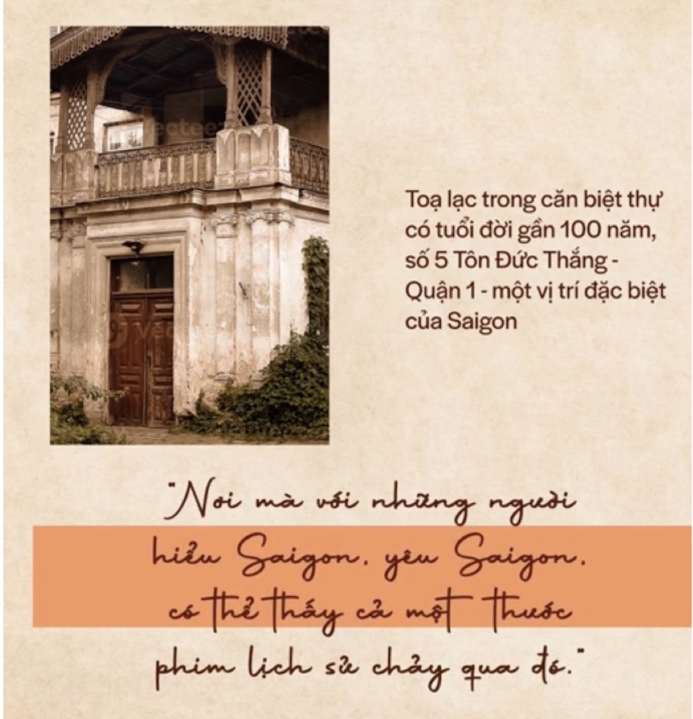 Toạ lạc trong căn biệt thự có tuổi đời gần 100 năm, số 5 Tôn Đức Thắng - Quận 1 - một vị trí đặc biệt của Saigon, nơi mà với những người hiểu Saigon, yêu Saigon, có thể thấy cả một thước phim lịch sử chảy qua đó.