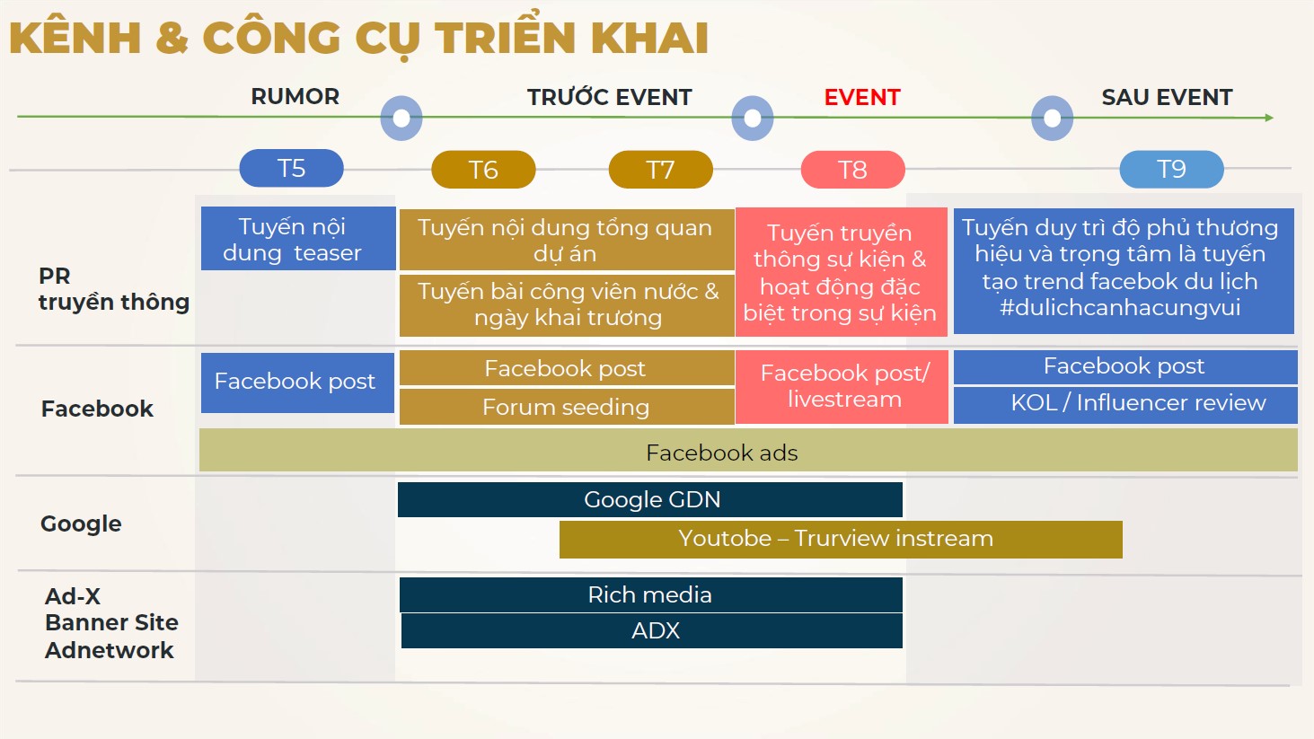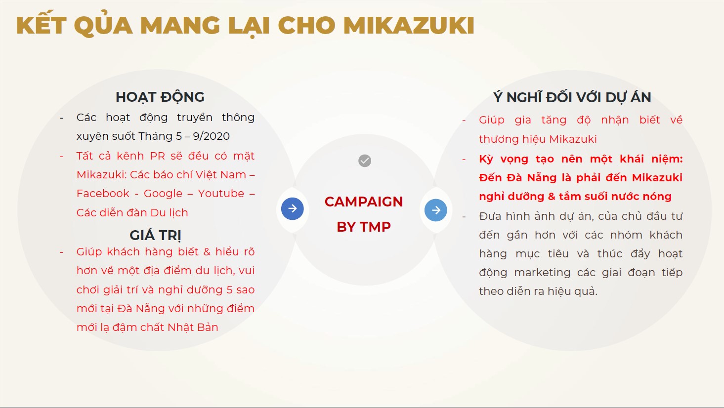 TMP có trách nhiệm tư vấn triển khai những hoạt động marketing xuyên suốt Tháng 5 – 9/2020. Tất cả kênh PR: Báo chí Việt Nam – Facebook - Google – Youtube – Các diễn đàn Du lịch. Mục tiêu đặt ra: