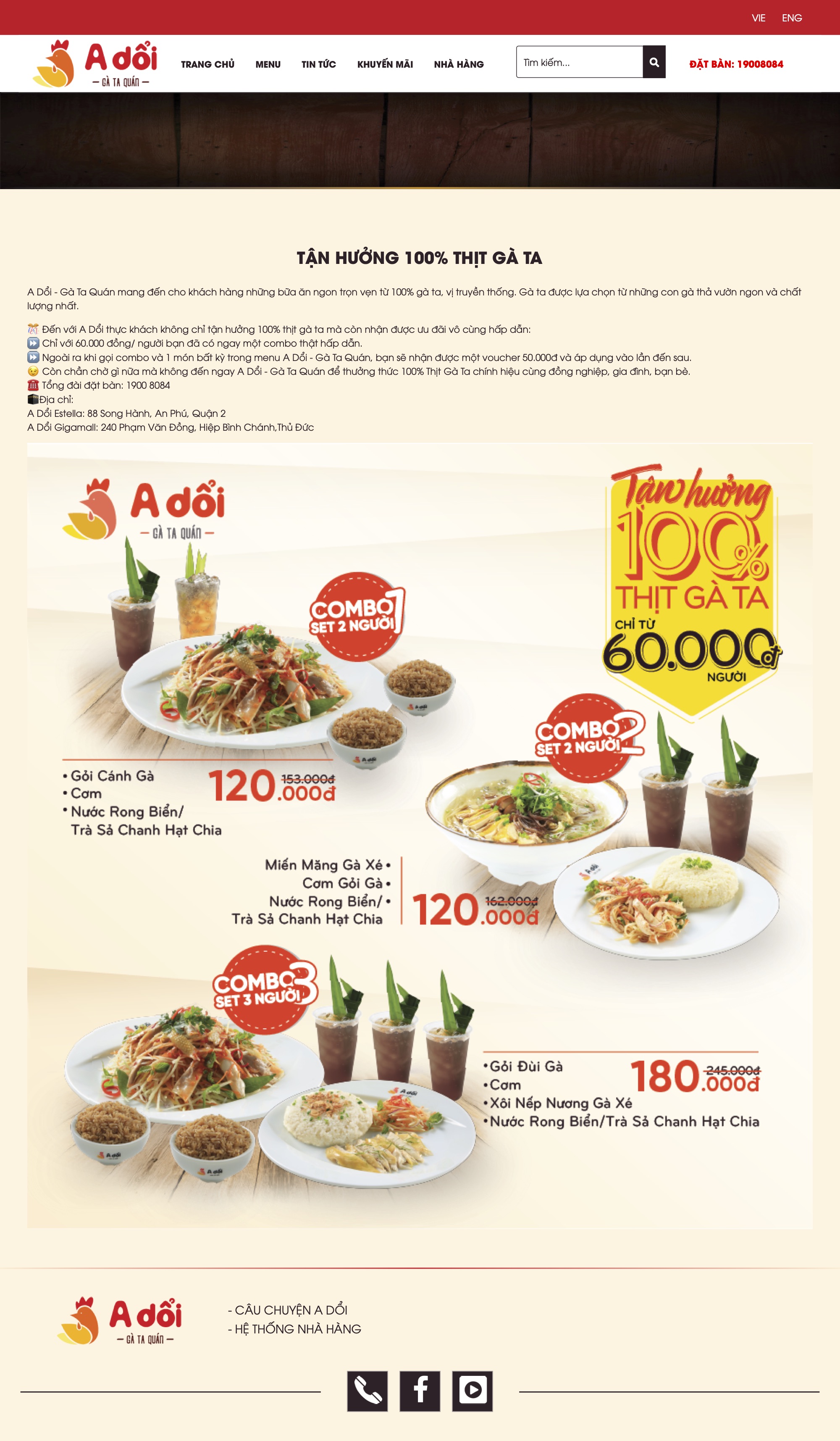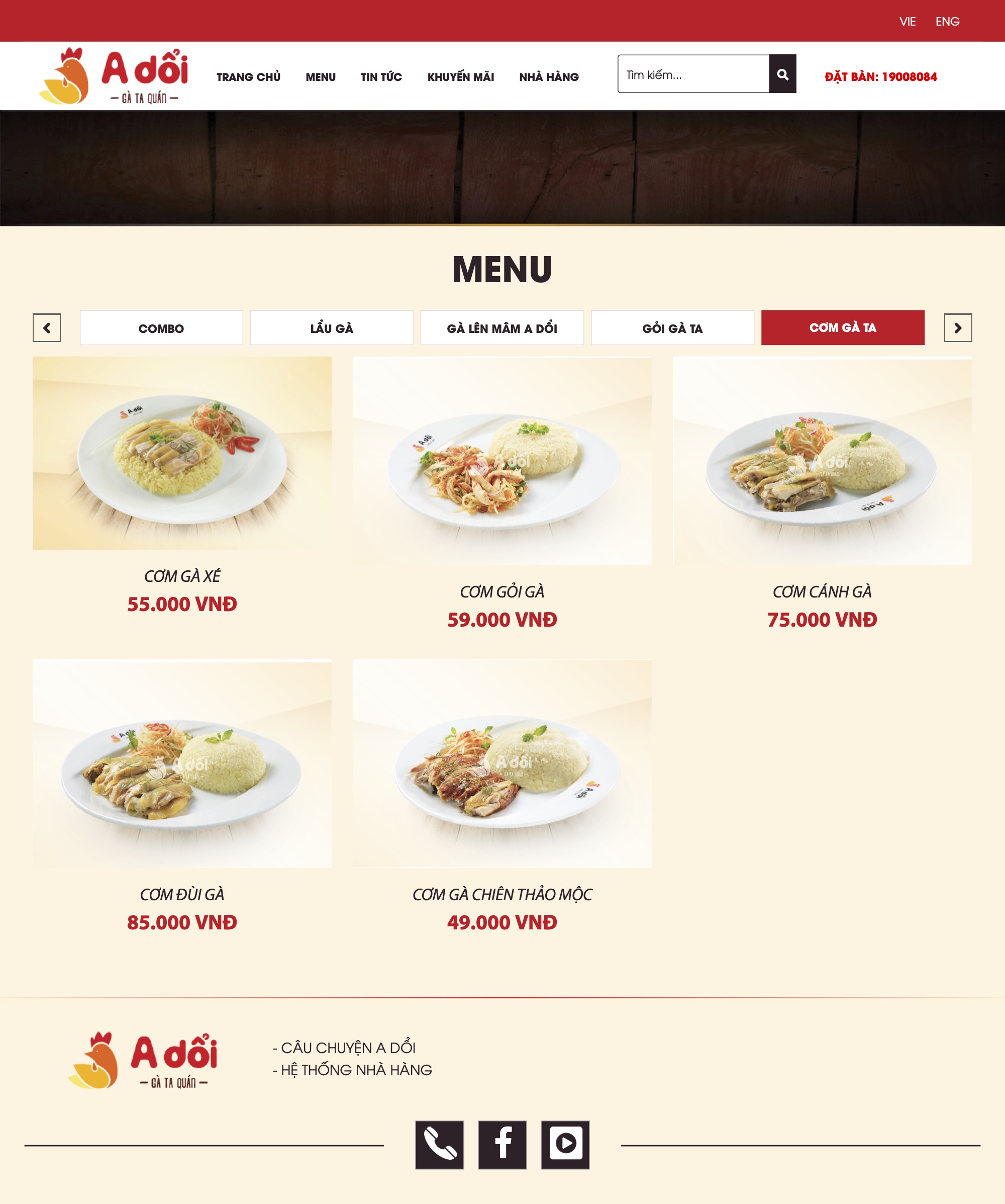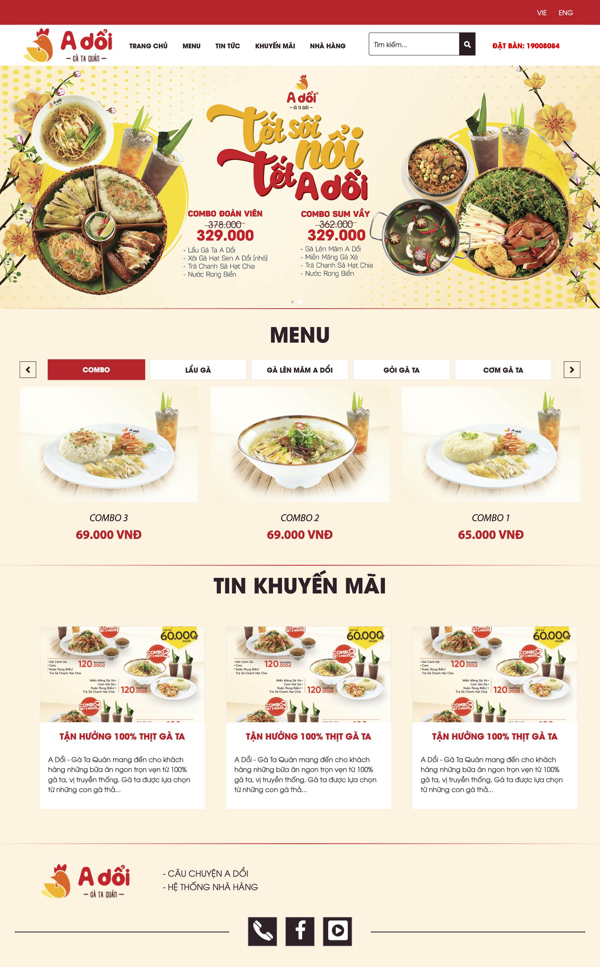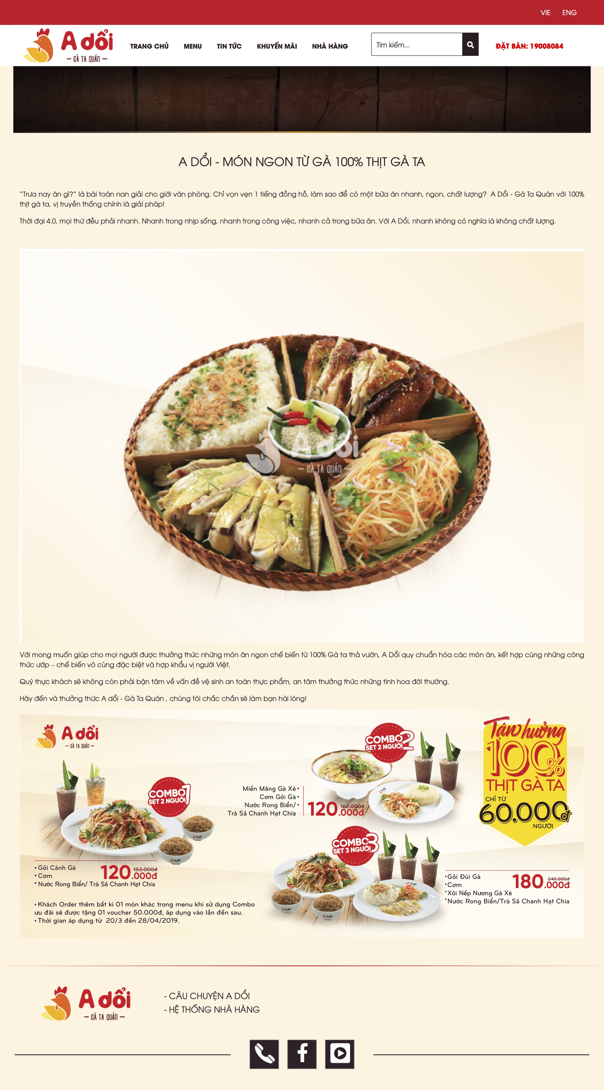Với Thương hiệu A Dổi - Gà ta quán, TMP thiết kế website như một giải pháp cho câu chuyện giải quyết bữa ăn trưa nhanh nhưng vẫn đảm bảo chất lượng trong thời đại 4.0. Giao diện bắt mắt, thông tin đầy đủ, ngắn gọn, các tùy chọn tìm kiếm và liên hệ dễ sử dụng, TMP tinh gọn tối đa để mang đến cho người xem con đường tiện lợi, nhanh chóng nhất cho bữa trưa “vội” của mình. Đồng thời, việc tiết kiệm thời gian cho khách hàng cũng là một lợi thế giúp A Dổi tối ưu hóa nguồn lực, chất lượng sản phẩm, mang lại hiệu quả doanh thu.