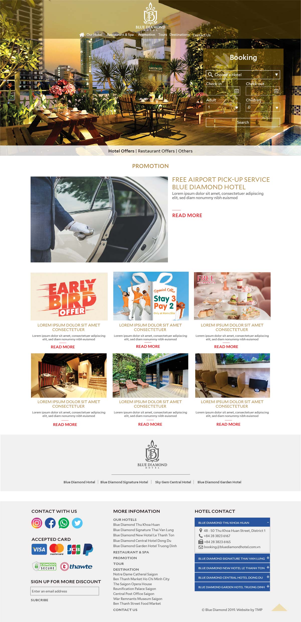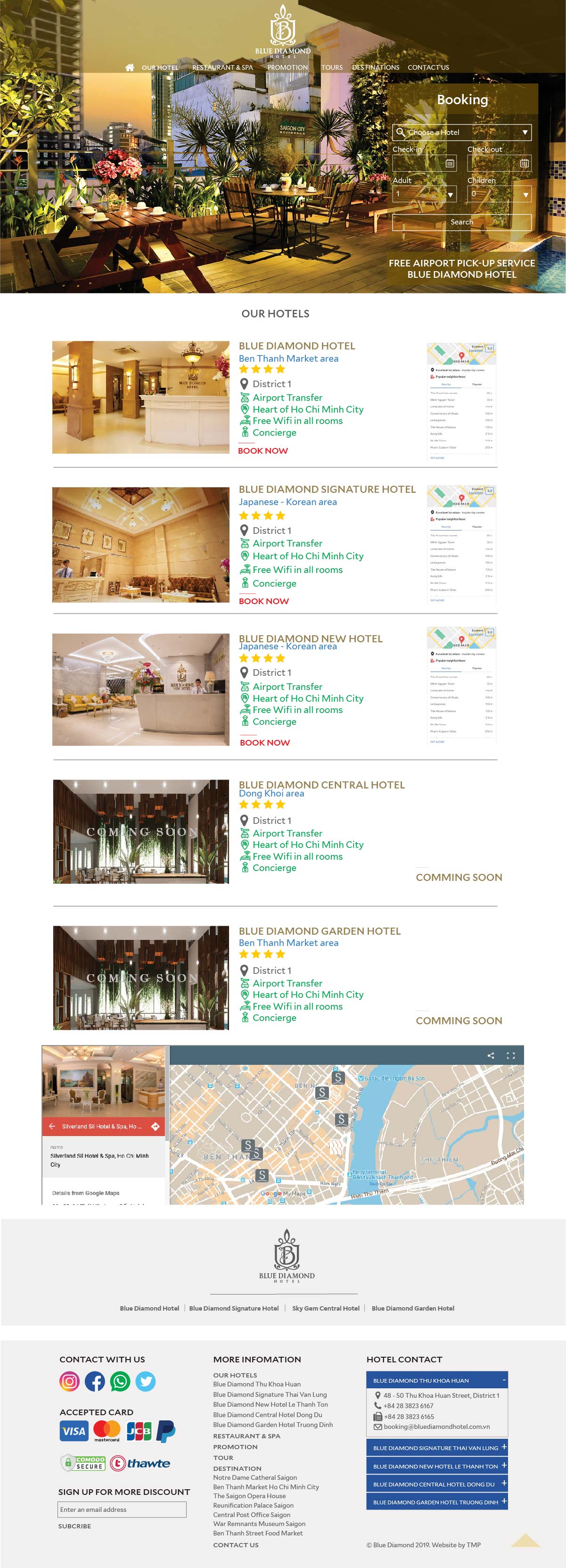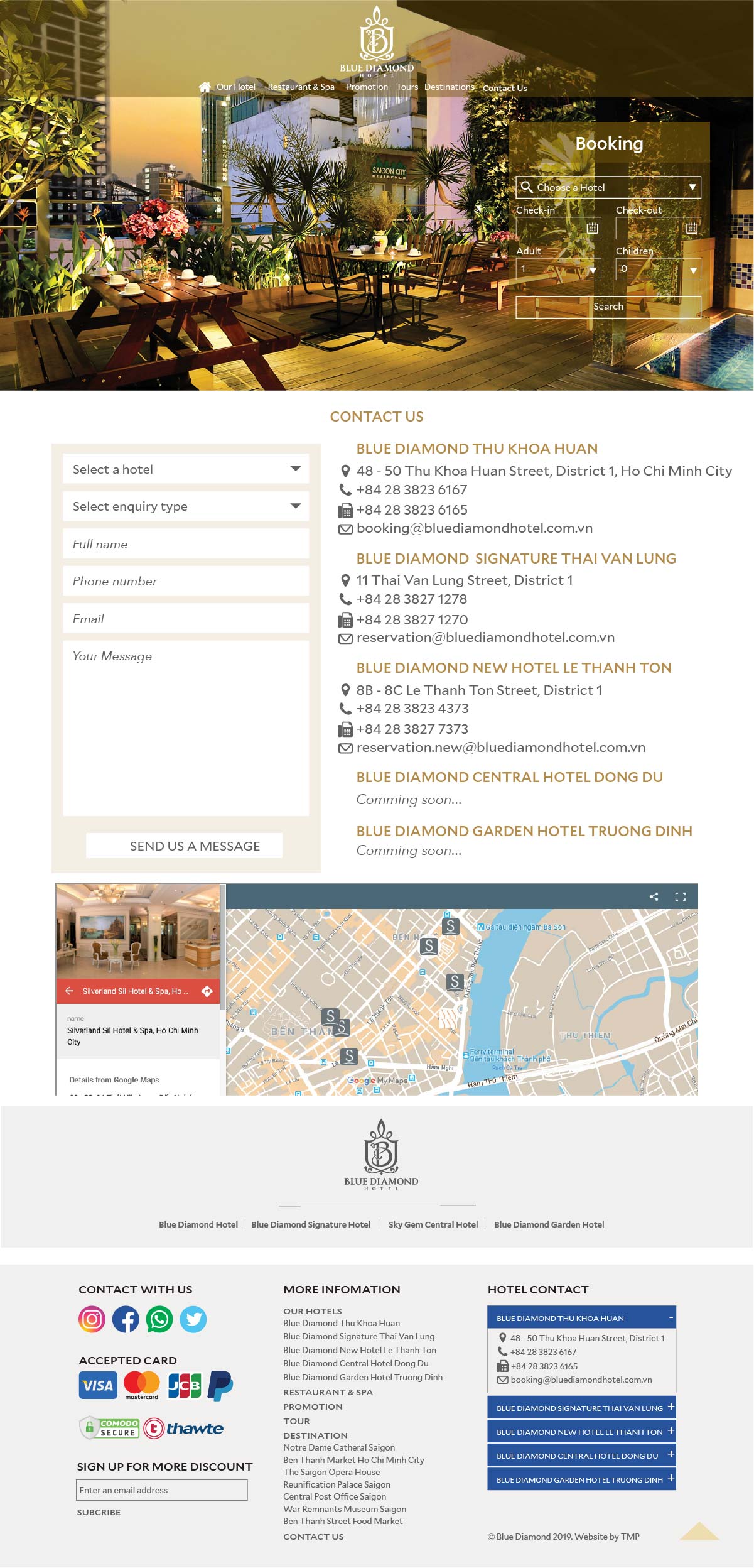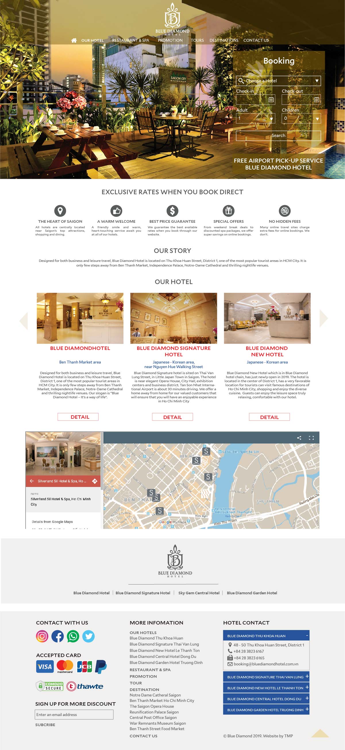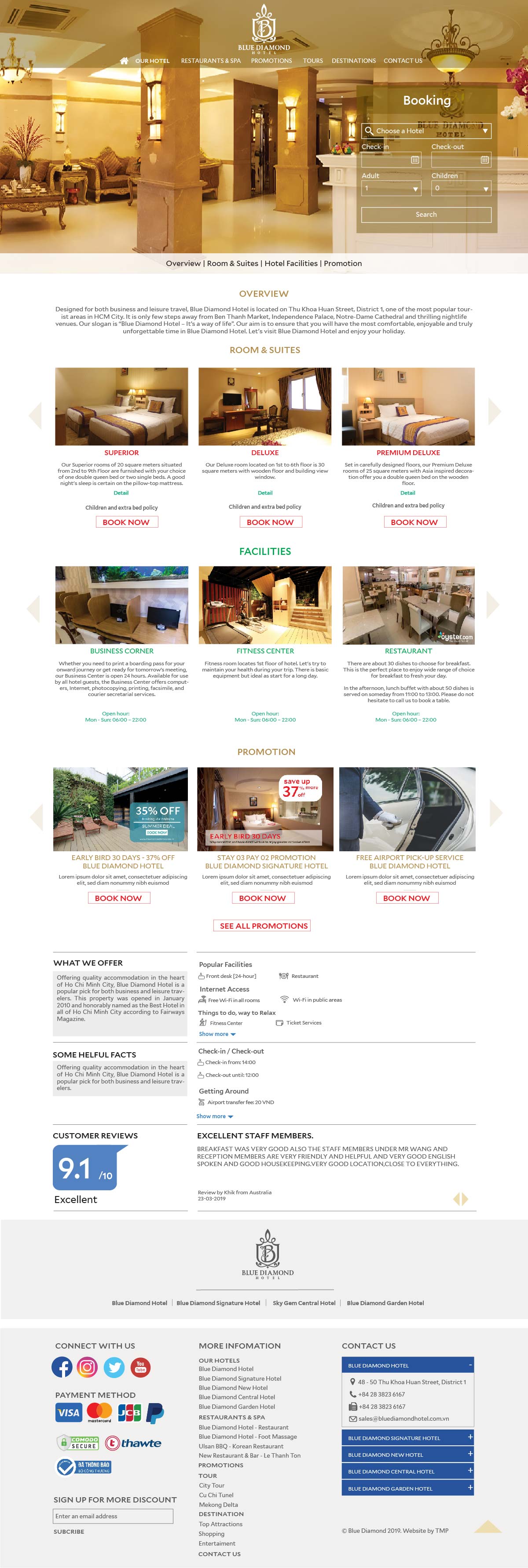 Khi xu hướng tìm hiểu và đặt phòng khách sạn online đã trở thành thói quen của khách hàng, TMP giúp Blue Diamond xây dựng nên một website thể hiện nét đặc trưng của nơi đây cùng sự thuận tiện cho việc truy cập, tìm kiếm thông tin cho khách hàng. Tại đây, khách hàng có thể cập nhật tất cả thông tin phục vụ cho nhu cầu của mình như: thông tin phòng, các dịch vụ kèm theo, giá cả, hình ảnh minh họa,...