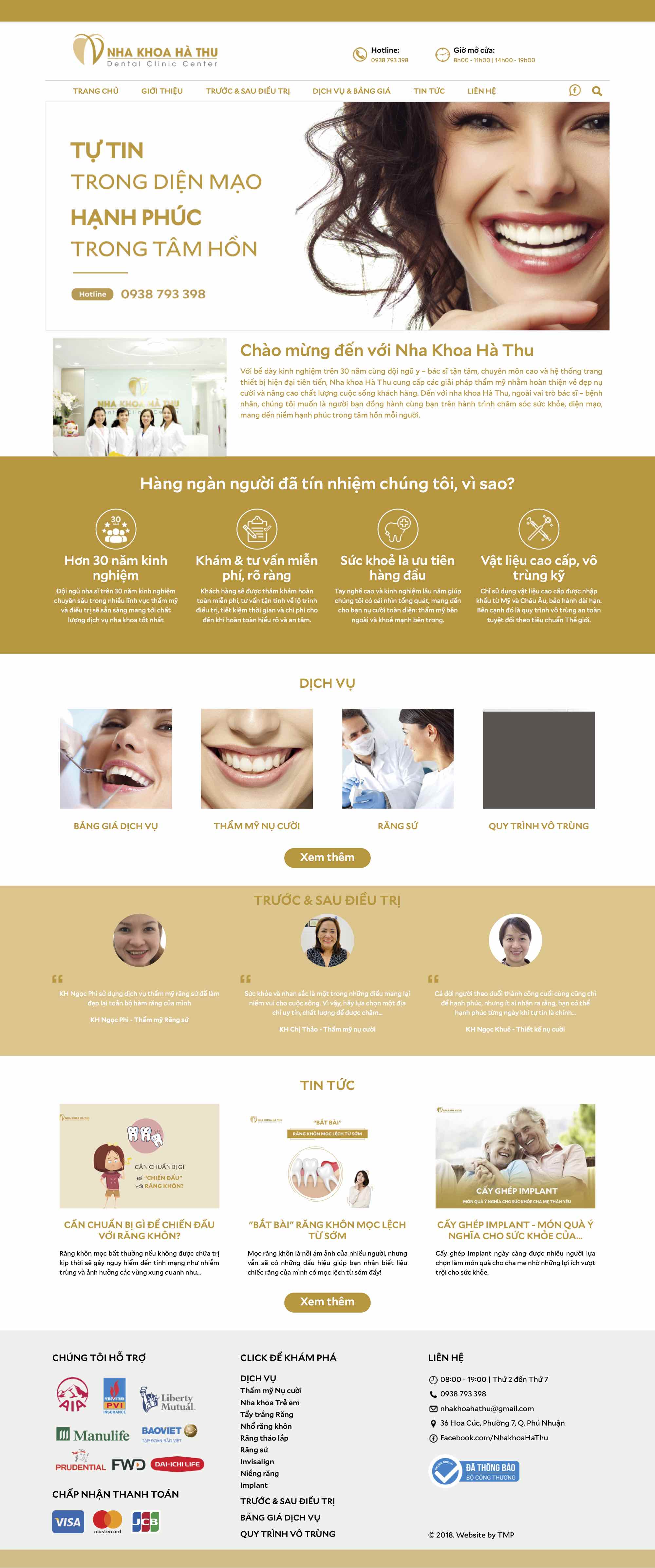 Nha khoa Hà Thu hoạt động trong lĩnh vực liên quan đến sức khỏe và sắc đẹp con người, vì vậy, thiết kế website TMP xây dựng theo tông màu chủ đạo trắng - vàng, tạo cảm giác an tâm, tin tưởng nơi người xem. Việc thiết kế và sắp xếp có logic của TMP tạo ra sự thuận tiện và tin cậy nơi người xem, từ đó giúp Nha khoa Hà Thu tiếp cận được đối tượng khách hàng tiềm năng và tăng doanh thu.