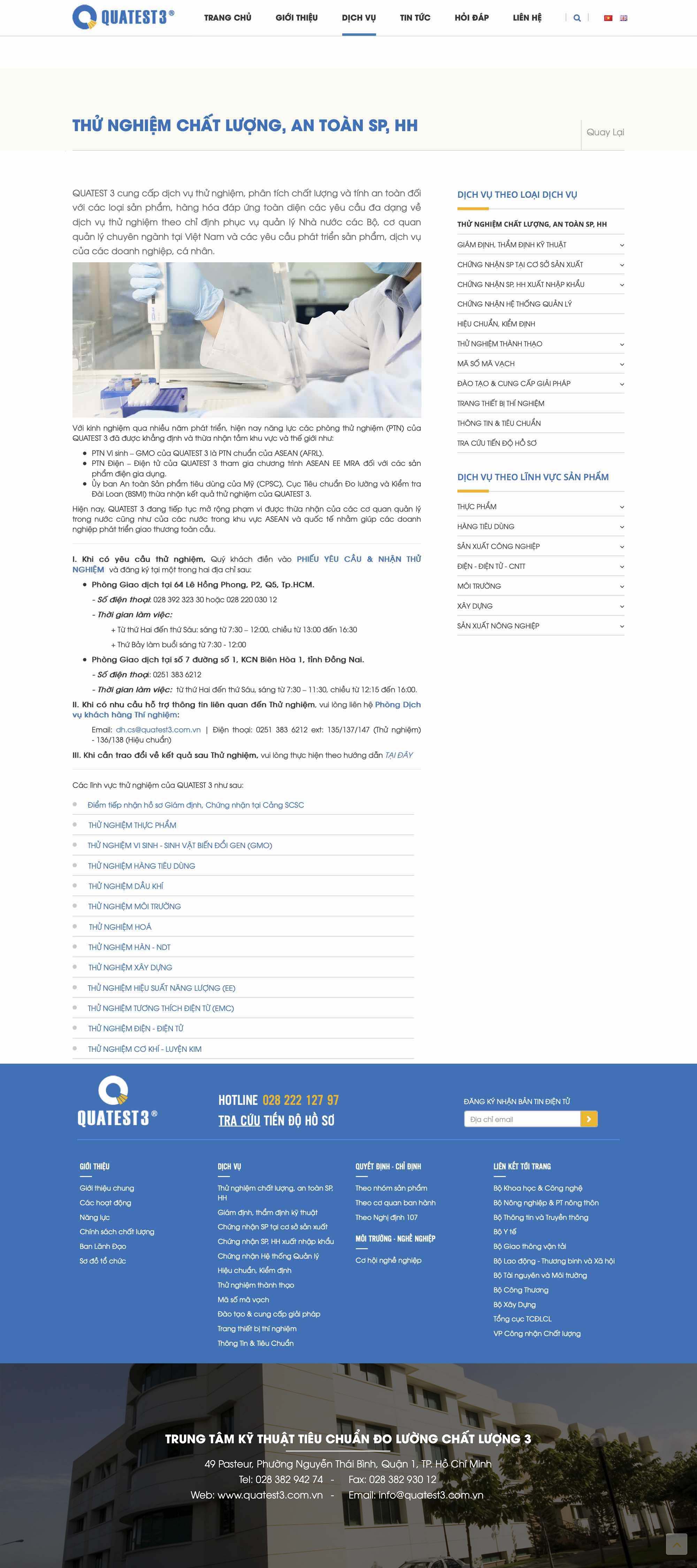 Và TMP đã thể hiện nổi bật điều đó trên website của Quatest 3, một website với những thông điệp chân thực nhưng phù hợp ngôn từ truyền thông & hình ảnh phòng thí nghiệm chân thực nhưng đẹp, hiện đại & có tác dụng mạnh mẽ với việc giới thiệu sản phẩm, năng lực dịch vụ hiệu quả hơn. Giao diện được lập trình để thông tin biên tập sắp xếp theo thứ tự rõ ràng, iúp mọi đối tượng có thể tiếp cận đơn giản, tìm kiếm thông tin dễ dàng