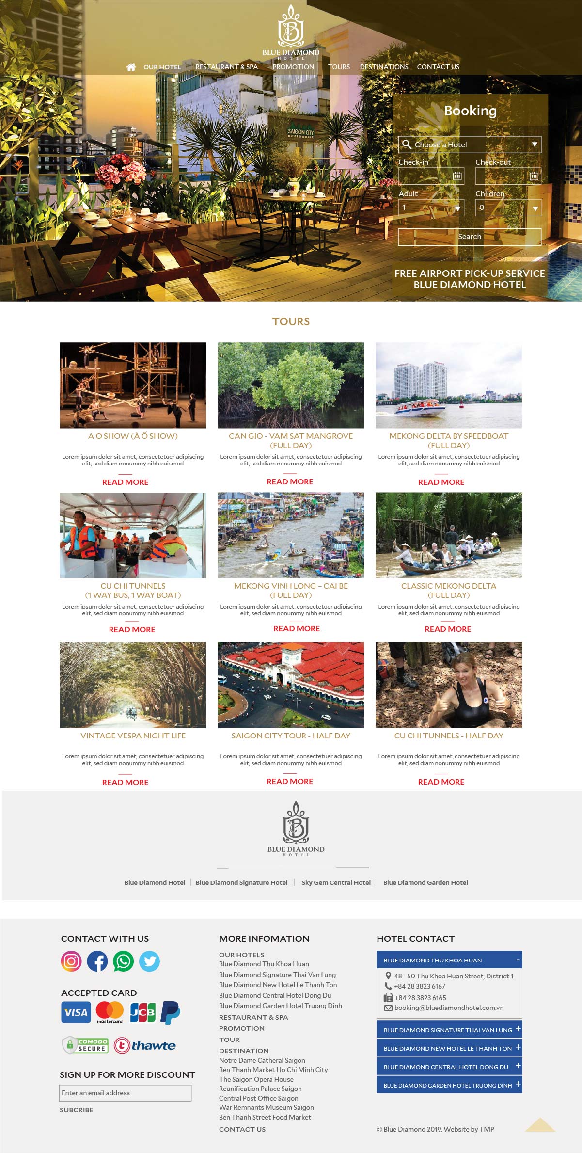 Khi xu hướng tìm hiểu và đặt phòng khách sạn online đã trở thành thói quen của khách hàng, TMP giúp Blue Diamond xây dựng nên một website thể hiện nét đặc trưng của nơi đây cùng sự thuận tiện cho việc truy cập, tìm kiếm thông tin cho khách hàng. Tại đây, khách hàng có thể cập nhật tất cả thông tin phục vụ cho nhu cầu của mình như: thông tin phòng, các dịch vụ kèm theo, giá cả, hình ảnh minh họa,...