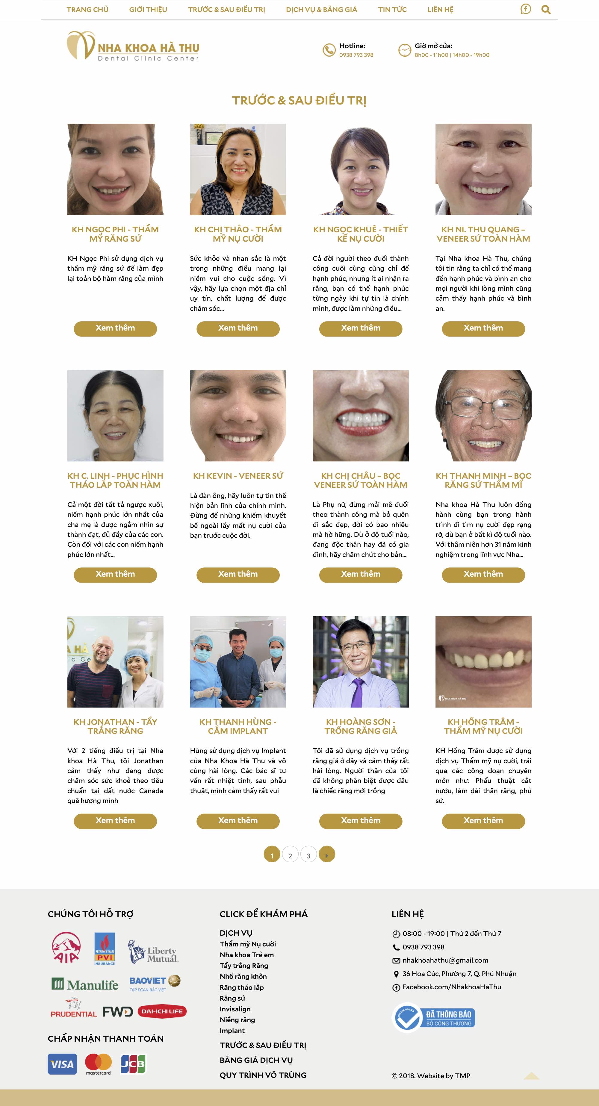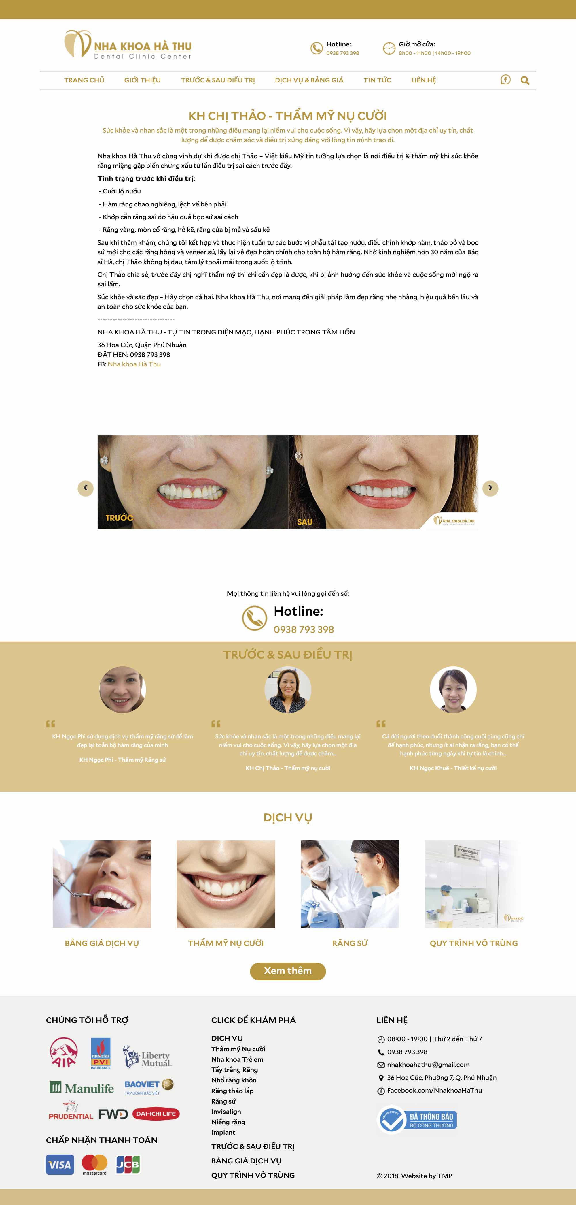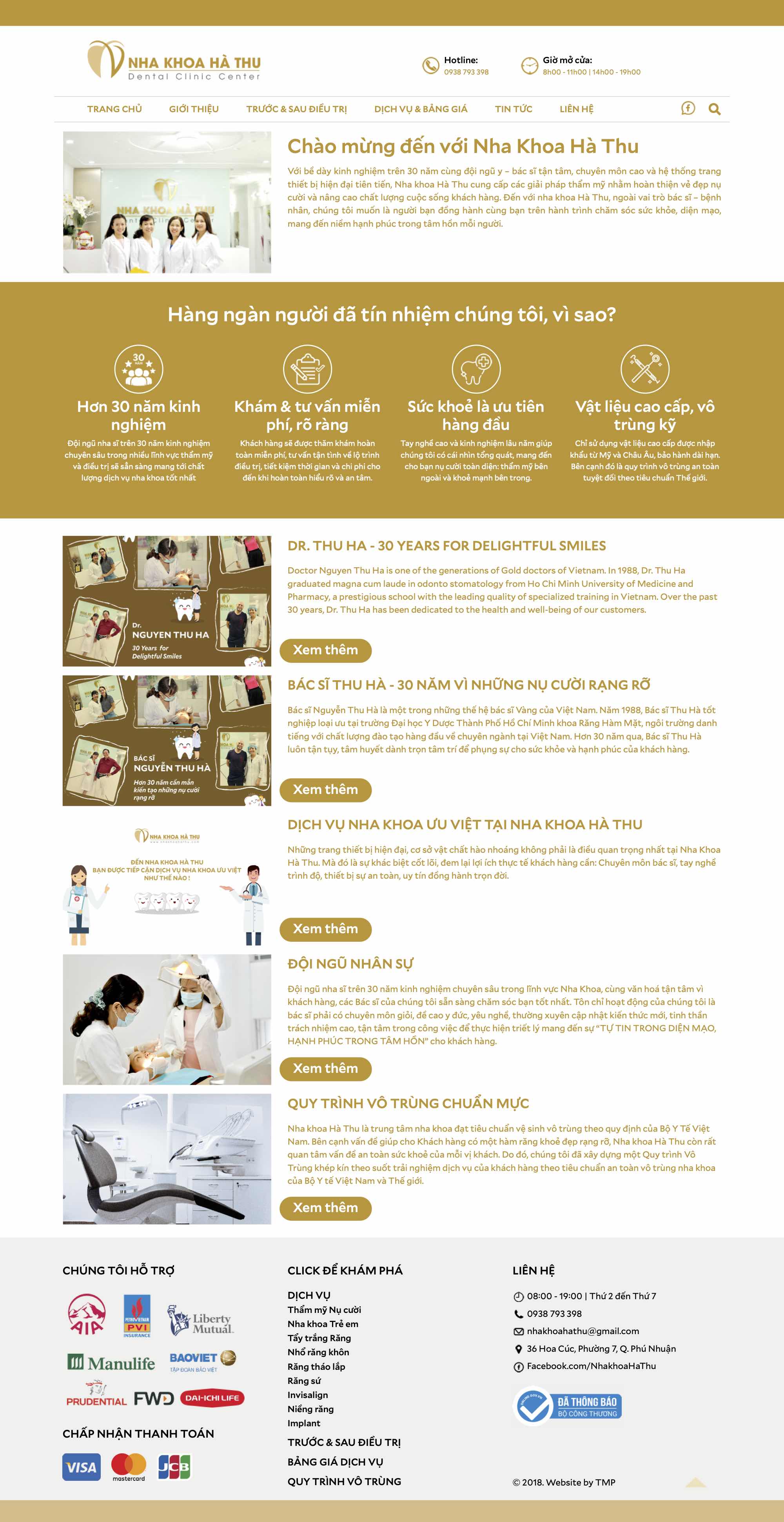 Nha khoa Hà Thu hoạt động trong lĩnh vực liên quan đến sức khỏe và sắc đẹp con người, vì vậy, thiết kế website TMP xây dựng theo tông màu chủ đạo trắng - vàng, tạo cảm giác an tâm, tin tưởng nơi người xem. Việc thiết kế và sắp xếp có logic của TMP tạo ra sự thuận tiện và tin cậy nơi người xem, từ đó giúp Nha khoa Hà Thu tiếp cận được đối tượng khách hàng tiềm năng và tăng doanh thu.